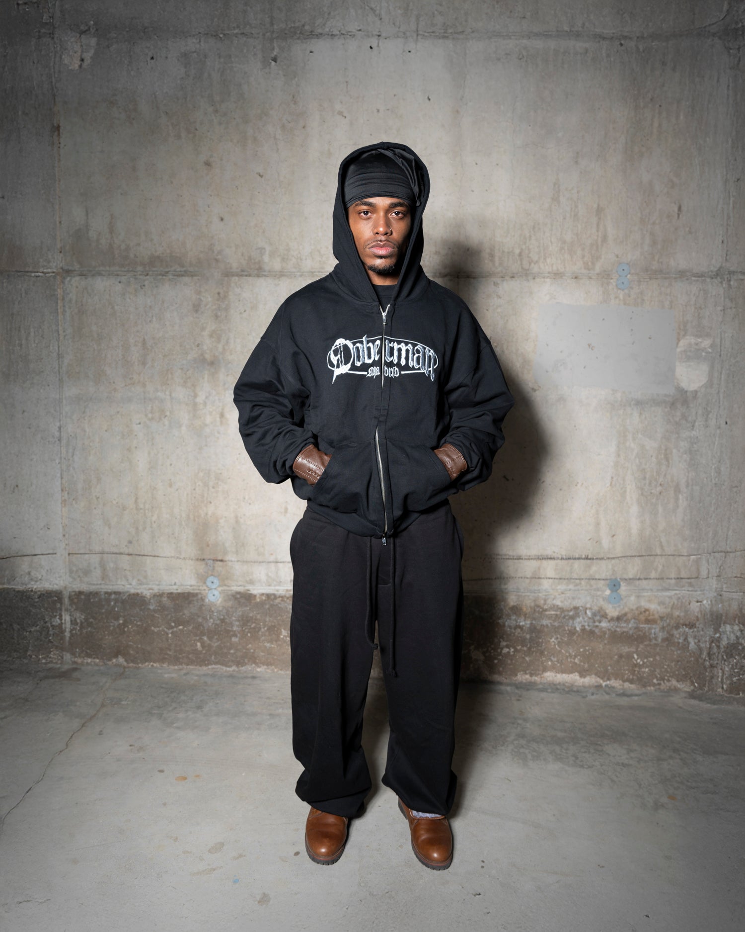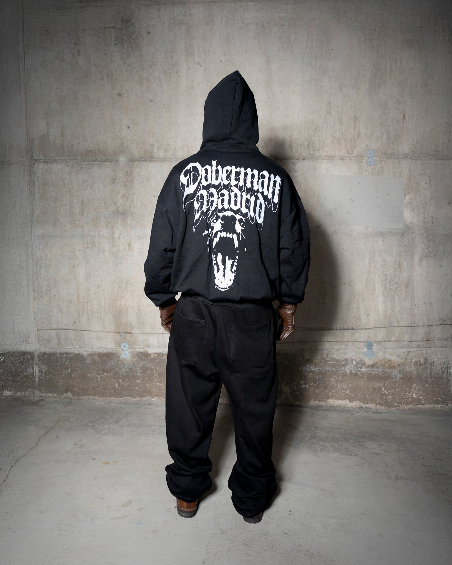 La armadura de Doberman para invierno. Canino Zipped Hoodie negra 440gsm, fit oversize y construcción pesada.